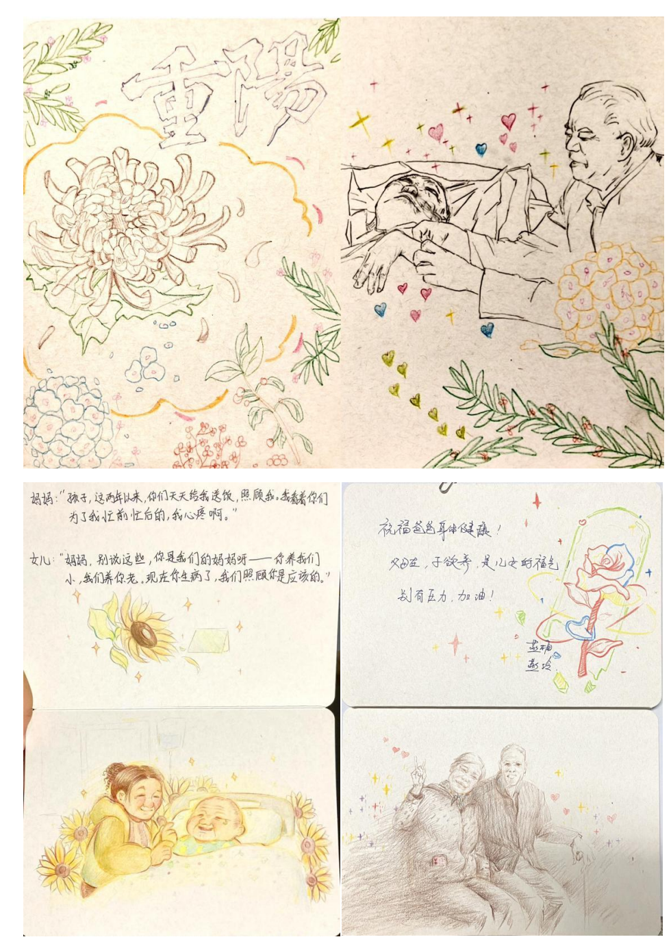 美术系学生们现场手绘温情瞬间,三五笔便呈现出生动温暖的一面,师生为老人们送上了亲手绘制、写满祝福的卡片,一份份小巧的礼物承载着真挚的问候,为患者和家属定格相处的温馨时刻。