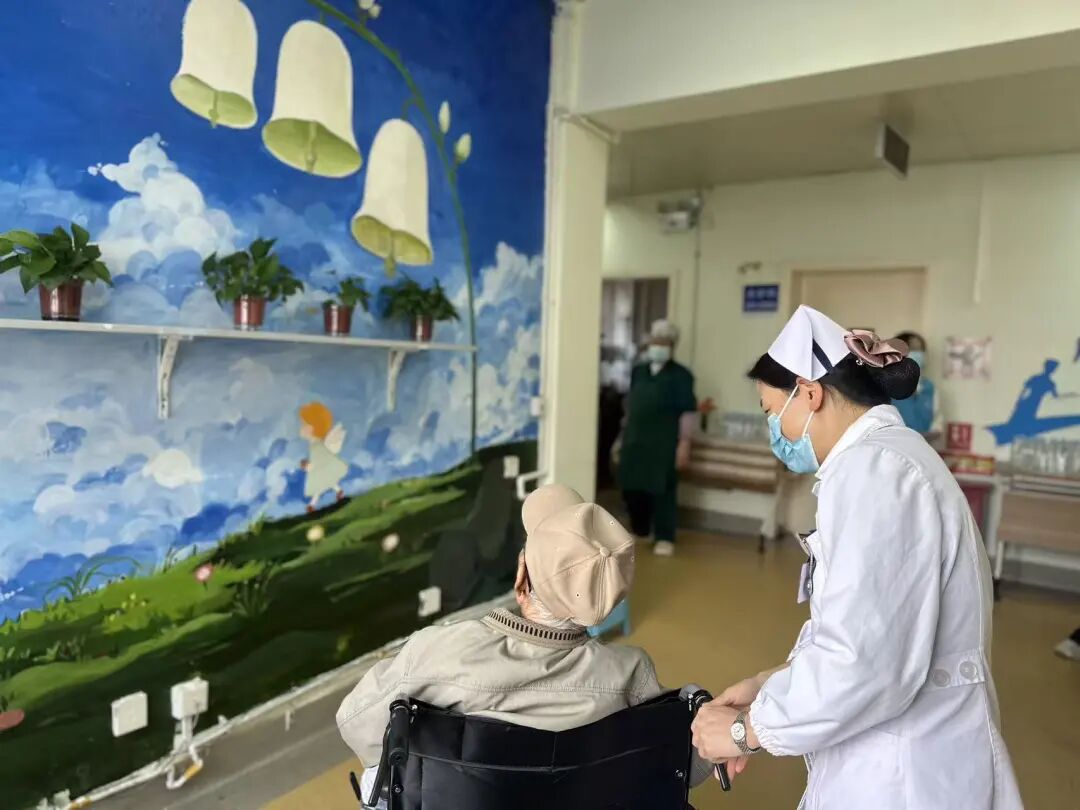 (护士带领老人欣赏“昌新爱之光”团队绘画的风铃花。风铃花的花语是温柔的爱和感谢,同时也有坚持的意思,希望患者和家属可以把爱坚持下去。)