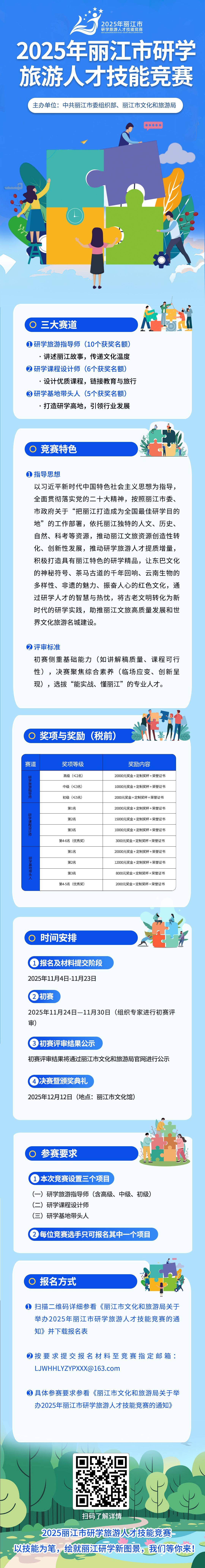 注:扫海报中的二维码或者点开附件链接可查看《丽江市文化和旅游局关于举办2025年丽江市研学旅游人才技能竞赛的通知》及《2025年丽江市研学旅游人才技能竞赛报名表》。