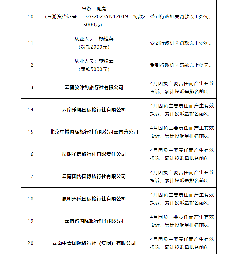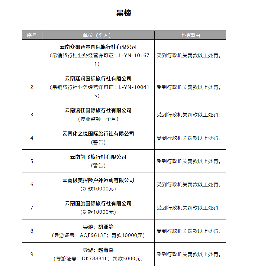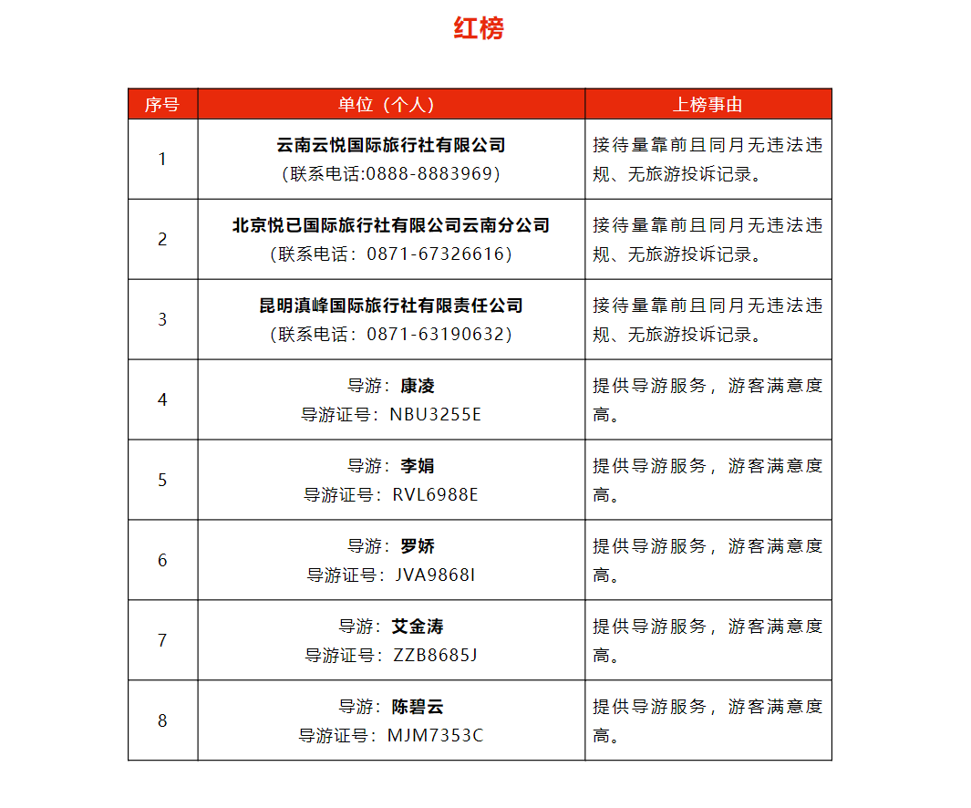 根据《昆明市旅行社、分社及从业人员“红黑榜”制度》,现将2025年4月“红黑榜”信息发布如下: