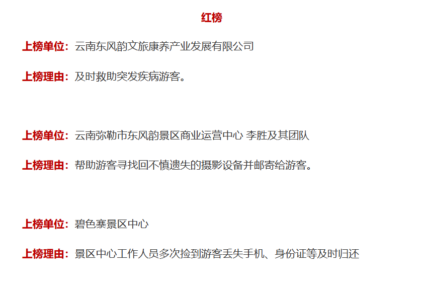 近日,云南省玉溪市发布2025年第二期文旅“红黑榜”,详情如下: