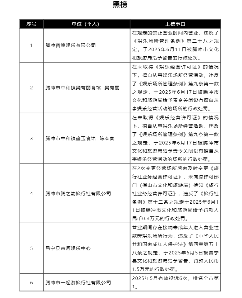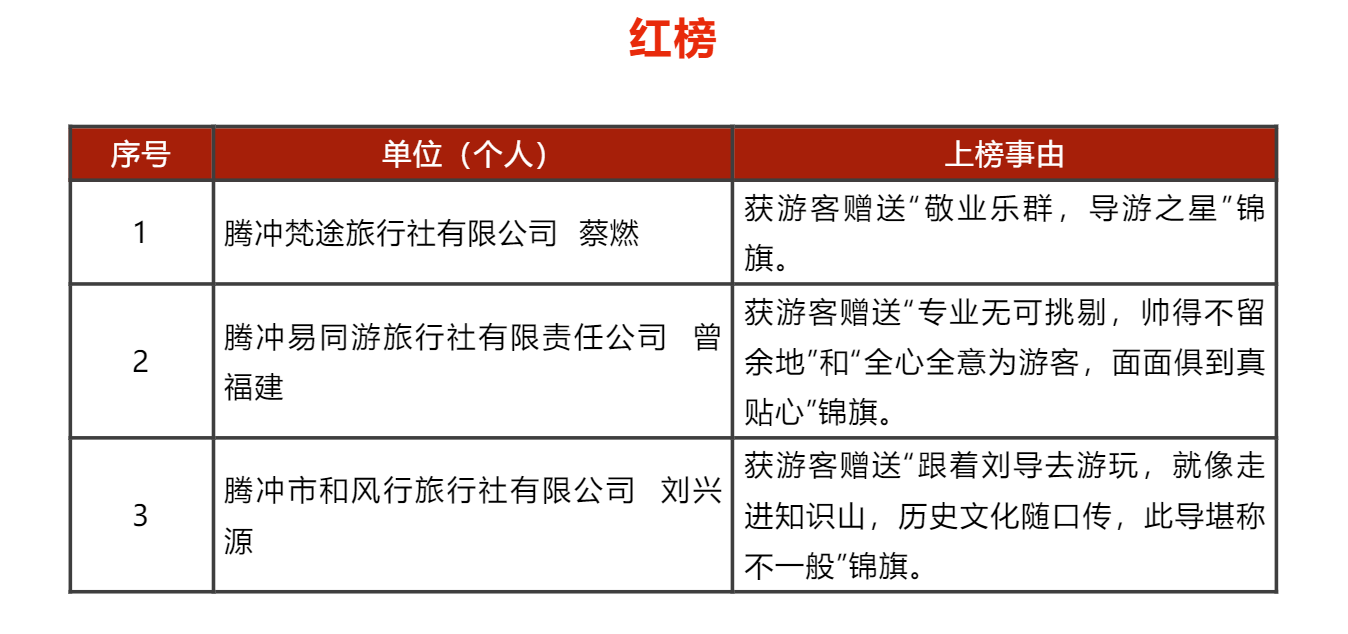 为认真贯彻落实《云南省人民政府关于印发云南省旅游市场秩序整治工作措施的通知》(云政发〔2017〕19号)精神,根据《保山市文化和旅游“红黑榜”制度》,决定将诚信守法的涉文、涉旅企业和有关从业人员纳入红榜,予以通报表扬;将违反文化、旅游相关法律法规,受到行政处罚的涉文、涉旅企业和有关从业人员纳入黑榜,予以通报警戒。现将名单通告如下,接受社会监督。