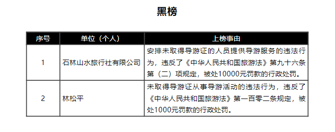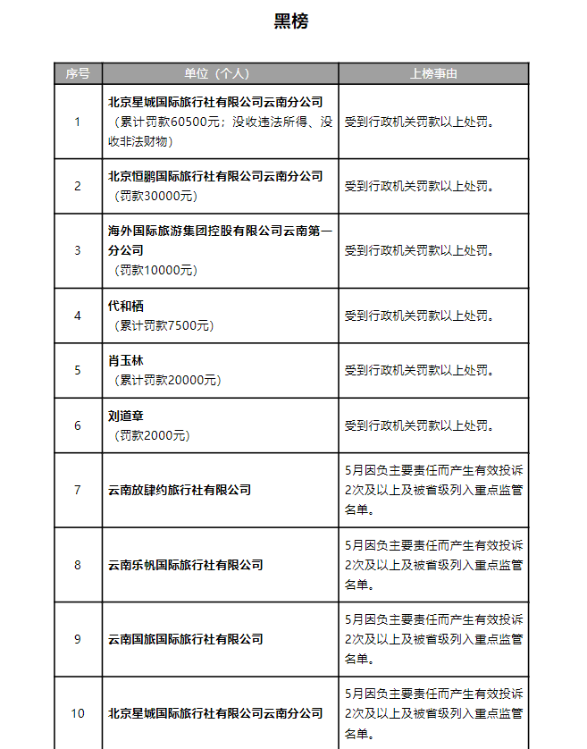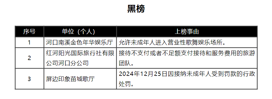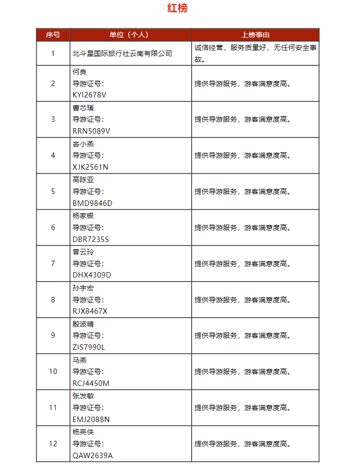 根据《云南省加强旅游市场秩序整治若干工作措施》(云旅整治办〔2023〕1号)文件要求,将诚信守法的文旅企业和从业人员纳入红榜,予以通报表扬;将违反文旅相关法律法规受到行政处罚的文旅企业和从业人员纳入黑榜,予以通报警戒,并纳入重点监管;被吊销业务经营许可证或从业资质的单位或个人将列入行业禁入管理。现将2025年度第四期“红黑榜”进行公布,接受社会监督。