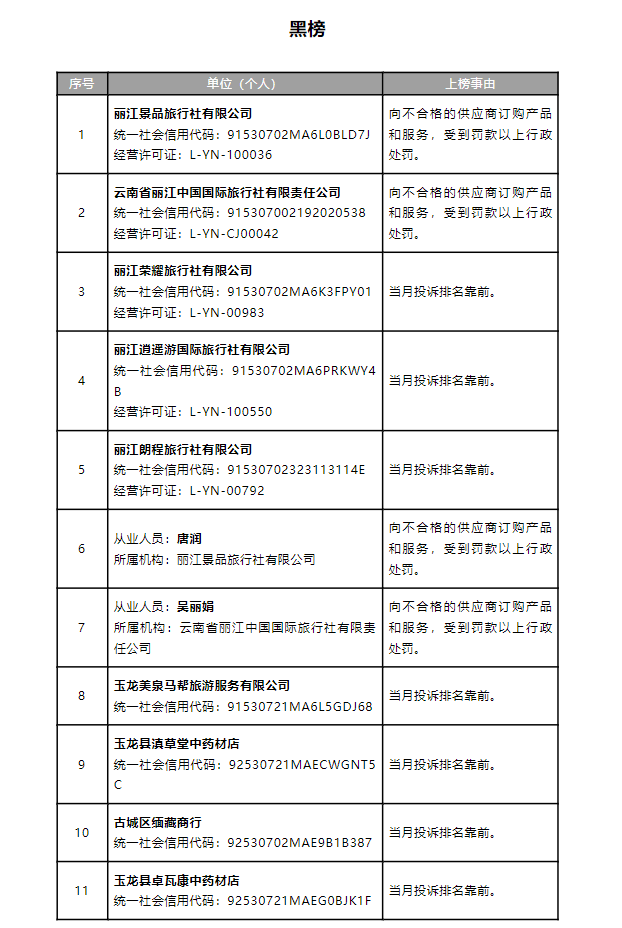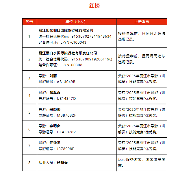近日,云南省丽江市发布2025年第五期文旅“红黑榜”,详情如下: