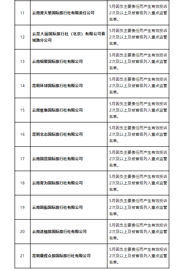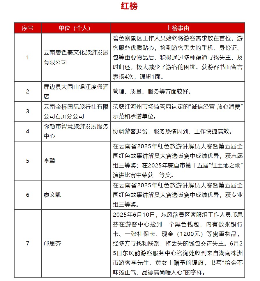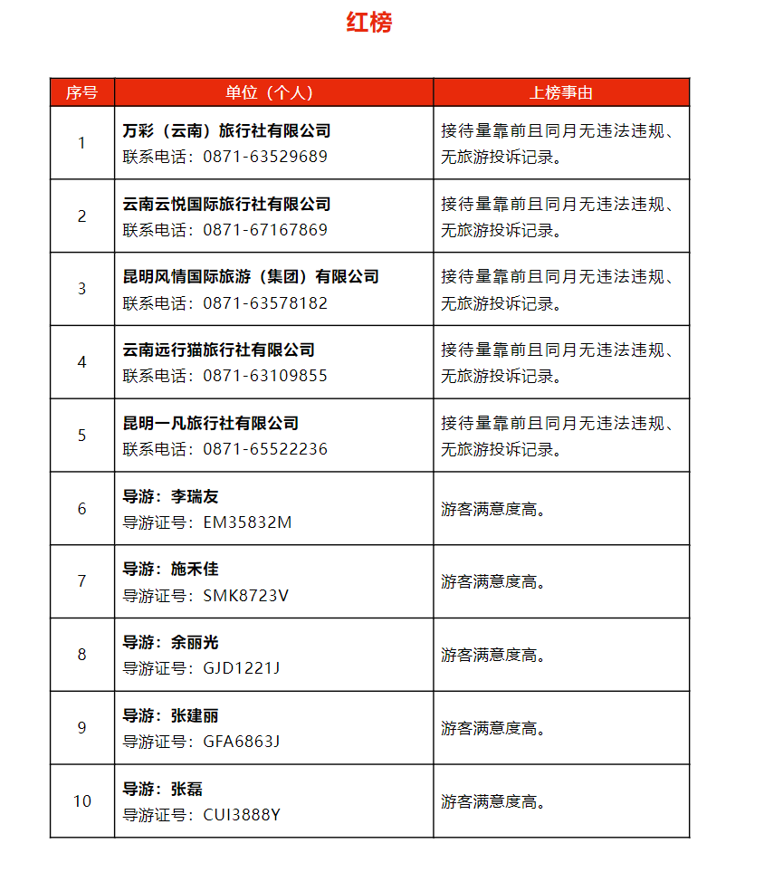 根据《昆明市旅行社、分社及从业人员“红黑榜”制度》,云南省昆明市发布2025年6月文旅“红黑榜”,详情如下: