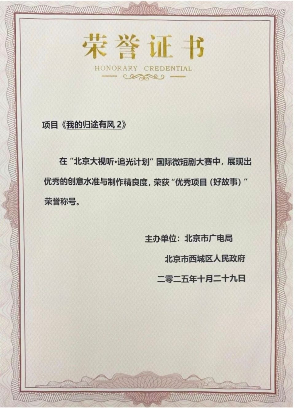 11月5日,在刚刚圆满落幕的2025中国广播电视精品创作大会北京大视听“追光计划”国际微短剧大赛总决赛上,由云南省委宣传部、省委网信办、省民族宗教事务委员会、省商务厅、省文化和旅游厅、省广播电视局六部门支持组织实施的“风从云岭来——有一种叫云南的生活”百部云品微短剧的首部开篇之作——16集《我的归途有风2》获优秀项目(好故事),刘子凡获优秀制片人,王鳕鱼获优秀导演。