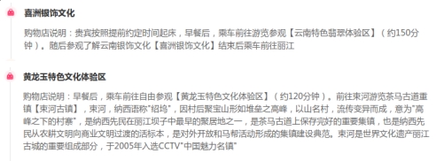 该旅游产品,涉及“喜洲银饰文化、黄龙玉特色文化展览馆”两个购物点。