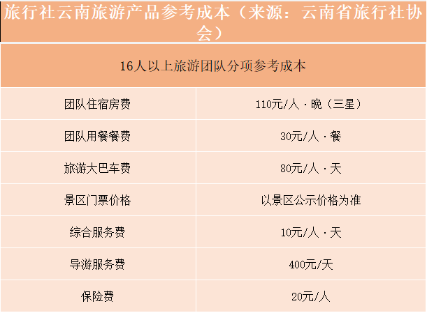 线路成本参考价/人=星级房价/人×入住天数+团队餐价/人×用餐次数+A级旅游景区门票价格/人+用车费/人×用车天数+综合服务费/人×出游天数+导游服务费/人×出游天数+保险费