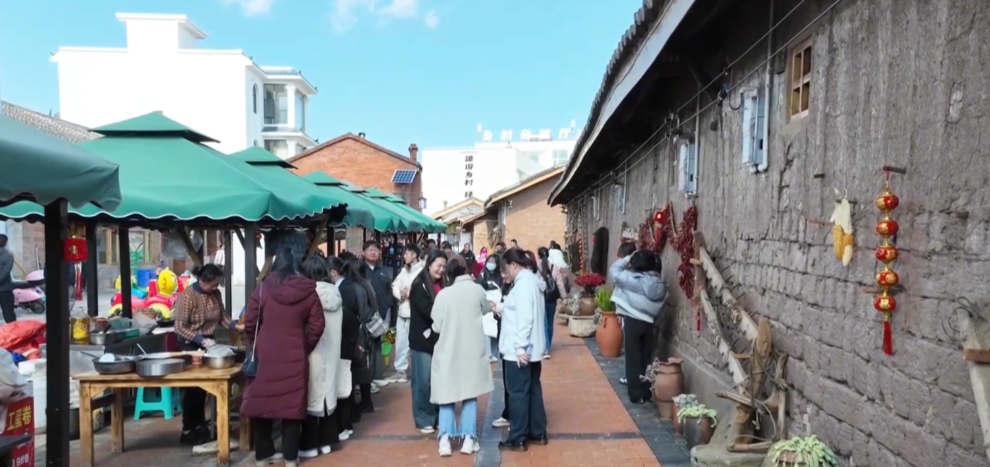 漫步其间,一侧是经过修缮的土基墙,墙上悬挂着犁、耙等传统农具,墙角摆放着火爆网络的“村花”;另一侧是遮阳摊位,每逢周末,周边村民纷纷将自家种植的果蔬、手工美食摆上集市,吆喝声此起彼伏。