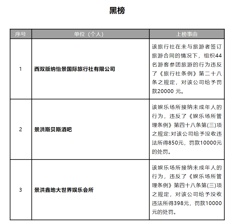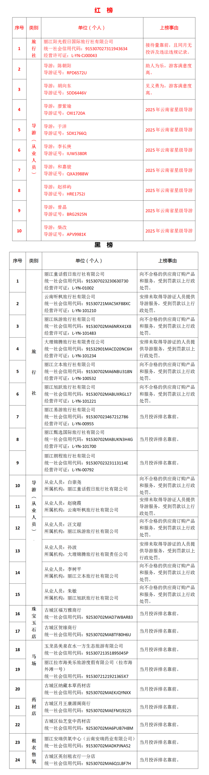 根据《云南省加强旅游市场秩序整治若干工作措施》(云旅整治办〔2023〕1号)文件要求,将诚信守法的文旅企业和从业人员纳入红榜,予以通报表扬;将违反文旅相关法律法规受到行政处罚的文旅企业和从业人员纳入黑榜,予以通报警戒,并纳入重点监管;被吊销业务经营许可证或从业资质的单位或个人将列入行业禁入管理。现将2025年度第七期“红黑榜”进行公布,接受社会监督。