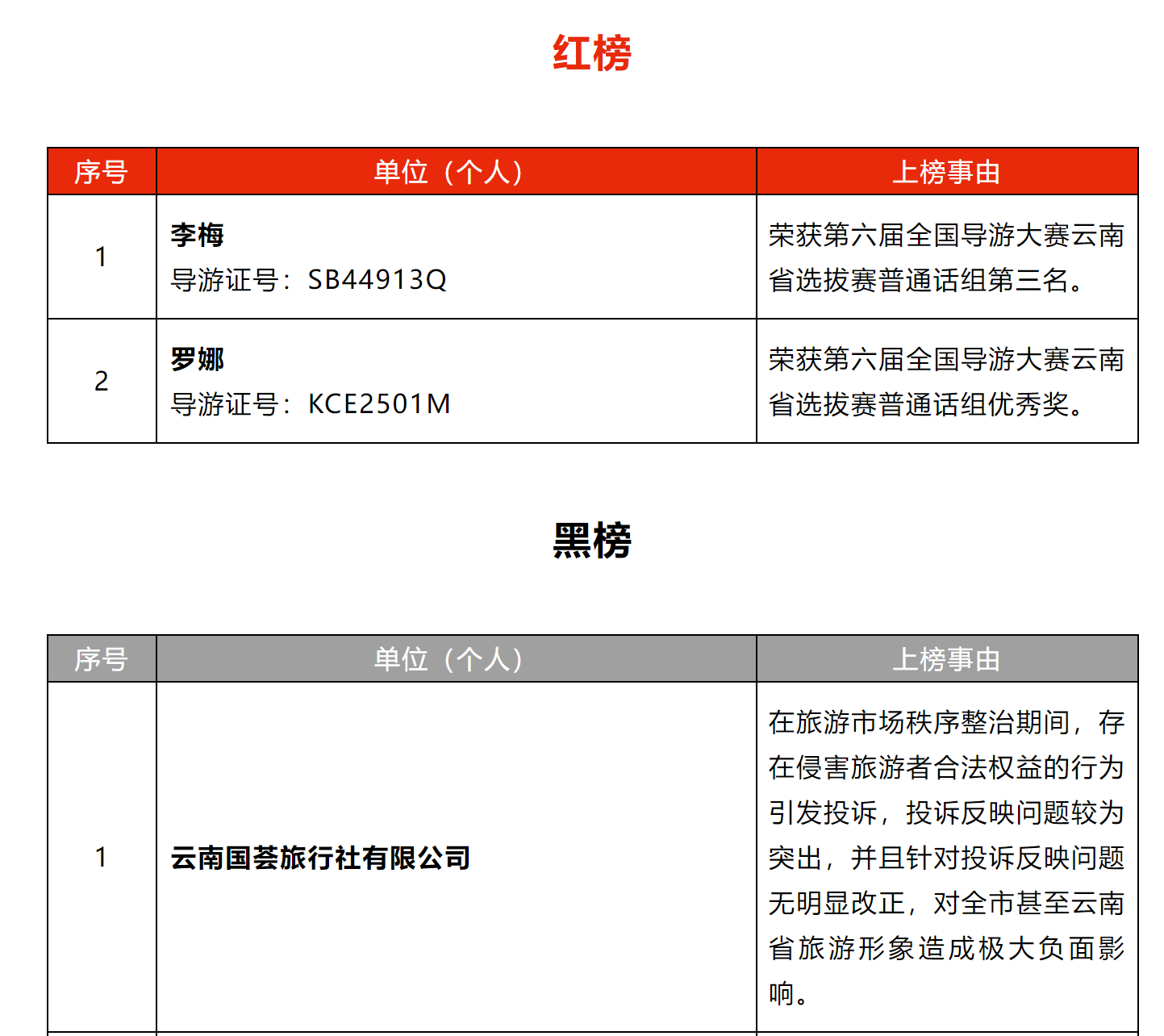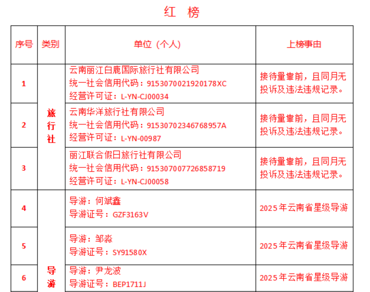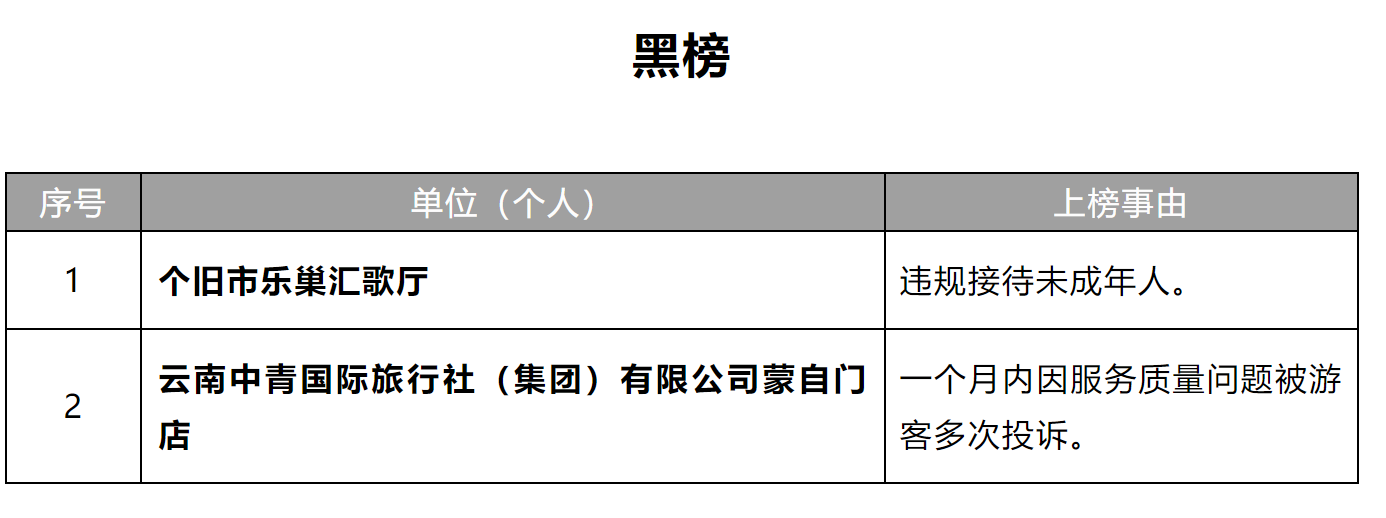 为维护我州文化和旅游市场秩序,加快文化和旅游领域信用体系建设,促进文化和旅游业高质量发展,根据《中华人民共和国旅游法》《旅行社条例》及其实施细则、《中央文明委关于推进诚信建设制度化的意见》《旅游经营服务不良信息管理办法(试行)》《导游管理办法》《旅游市场黑名单管理办法(试行)》等有关法律、法规和政策规章,按照楚雄州文化和旅游局“红黑榜”管理办法,现面向社会发布楚雄州文化和旅游局(2025)2号红黑榜。