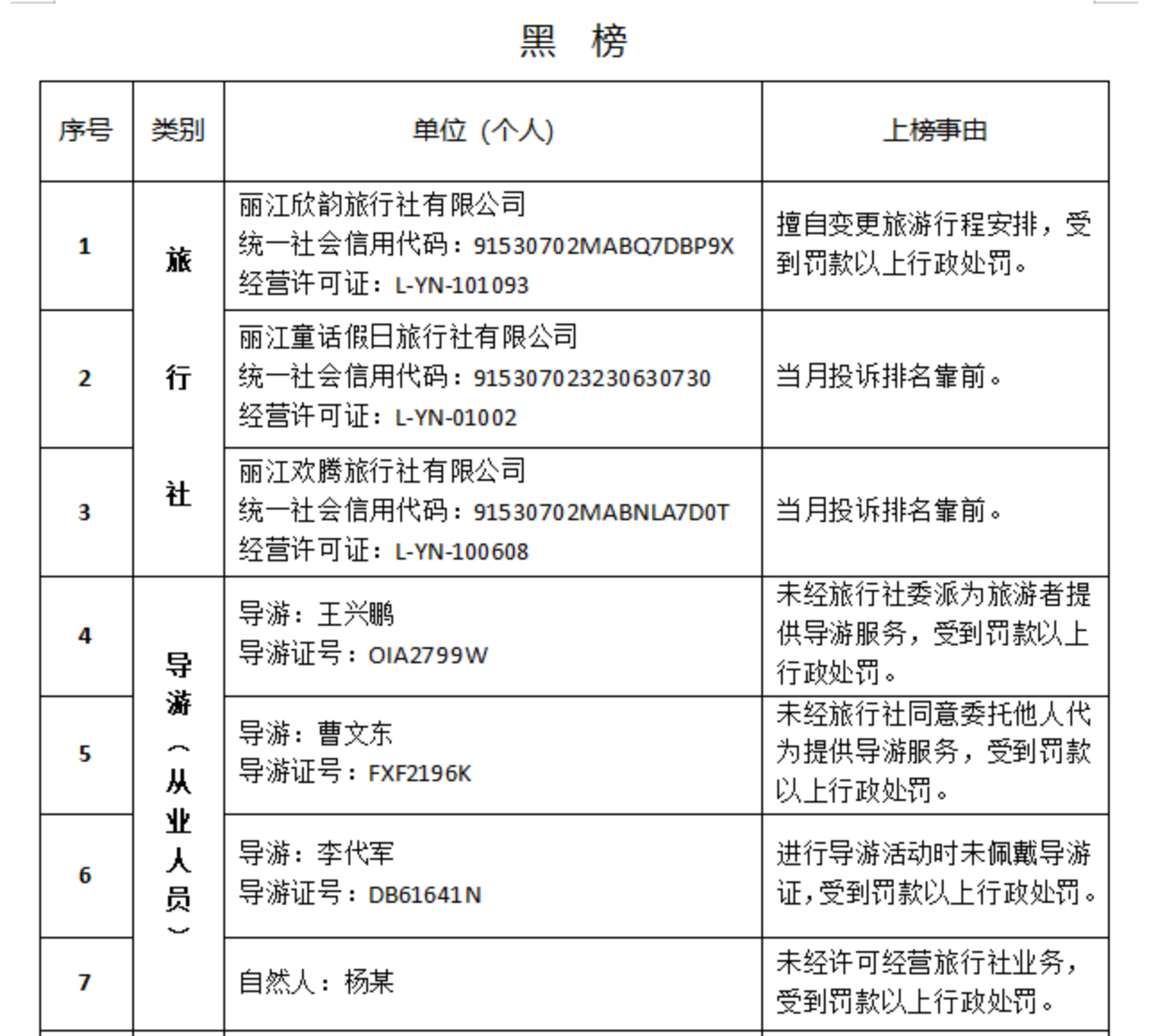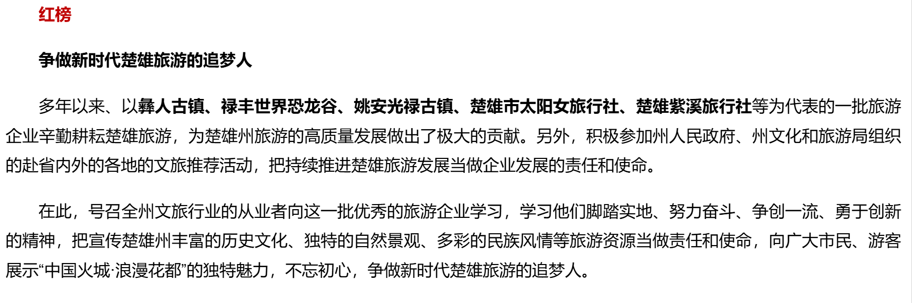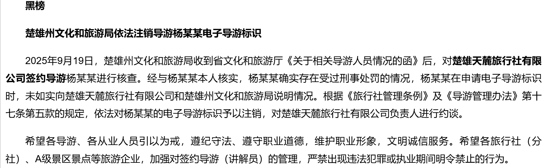 为维护我州文化和旅游市场秩序,加快文化和旅游领域信用体系建设,促进文化和旅游业高质量发展,根据《中华人民共和国旅游法》《旅行社条例》及其实施细则、《中央文明委关于推进诚信建设制度化的意见》《旅游经营服务不良信息管理办法(试行)》《导游管理办法》《旅游市场黑名单管理办法(试行)》等有关法律、法规和政策规章,按照楚雄州文化和旅游局“红黑榜”管理办法,现面向社会发布楚雄州文化和旅游局(2025)2号红黑榜。