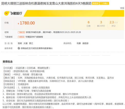 2025年10月28日,“游舆文旅大数据系统”监测到:昆明大理丽江送版纳含机票温德姆玉龙雪山大索洱海旅拍6天5晚跟团