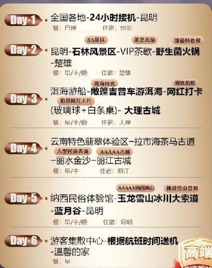 2025年10月28日,监测到标题为“昆明大理丽江送版纳含机票温德姆玉龙雪山大索洱海旅拍6天5晚跟团”的旅游产品,涉及“云南特色翡翠体验区、纳西民俗体验馆”两个购物点。