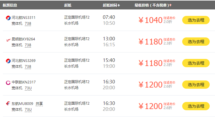 从行程看,河北至昆明出发时查询的往返机票价格最低为1040元。