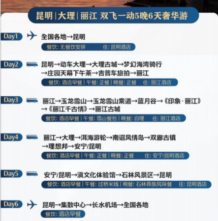 2025年10月24日,“游舆文旅大数据系统”监测到:全国出发昆明大理丽江双飞一动6天奢华跟团游一价全含0自费双表演