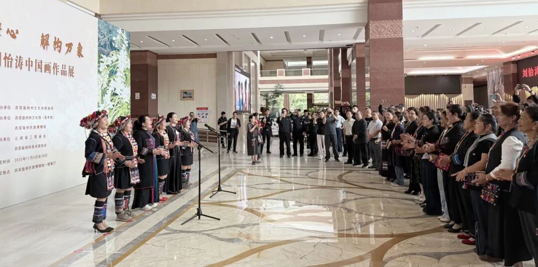 仪式在极具民族特色的浓郁氛围中拉开帷幕。哈尼族非遗代表性传承人现场献唱《迎宾曲》,歌声婉转悠扬,为画展增添了热烈而庄重的文化氛围。艺术家刘怡涛先生,以及来自西双版纳州政府新闻办、西双版纳州融媒体中心、西双版纳州文化和旅游局、西双版纳州文联、西双版纳州文化馆(美术馆)、西双版纳州市美术家协会、西双版纳州书法家协会、西双版纳州文化馆老知青艺术团等单位的代表,以及多家媒体记者,共同见证了这一文化盛事的启幕。
