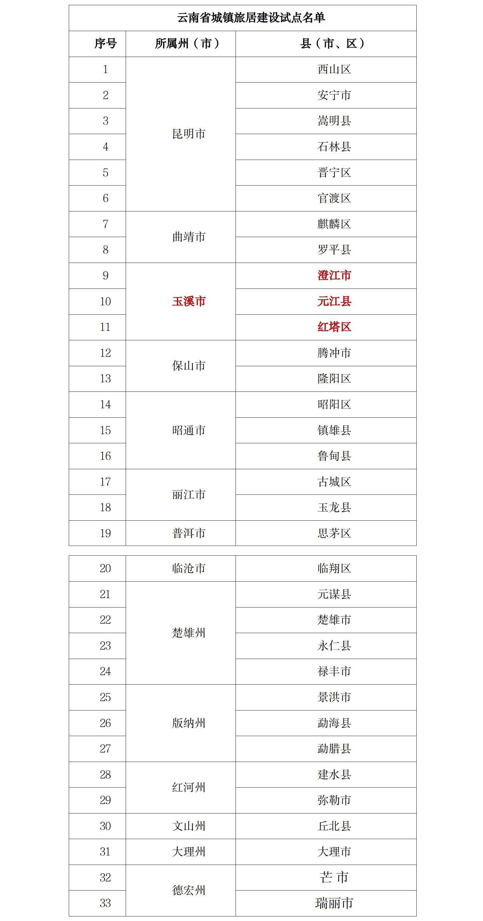 日前,云南省住房和城乡建设厅正式公布“旅居云南”城镇建设试点名单,本次试点共涵盖全省33个县(市、区),玉溪市澄江市、元江县、红塔区成功入选试点名单,为“旅居玉溪”建设打下坚实基础。