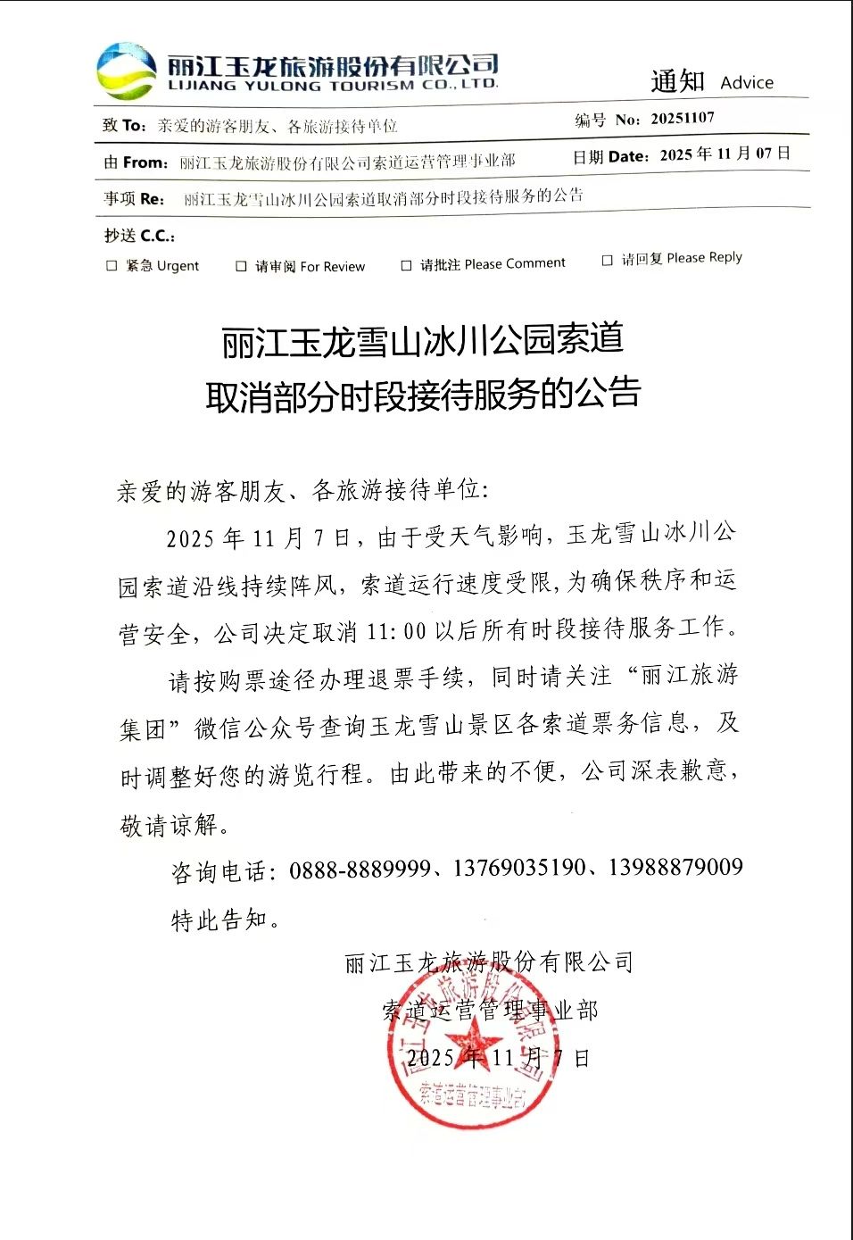 2025年11月7日,由于受天气影响,玉龙雪山冰川公园索道沿线持续阵风,索道运行速度受限,为确保秩序和运营安全,公司决定取消11:00以后所有时段接待服务工作。