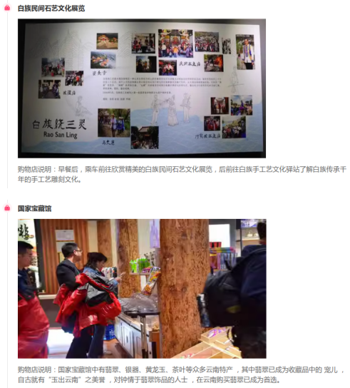 2025年11月7日,监测到标题为“【全国含机票+5钻酒店】云南旅游6天5晚跟团游昆明/大理/丽江”的旅游产品,涉及“白族民间石艺文化展览、国家宝藏馆”两个购物点。