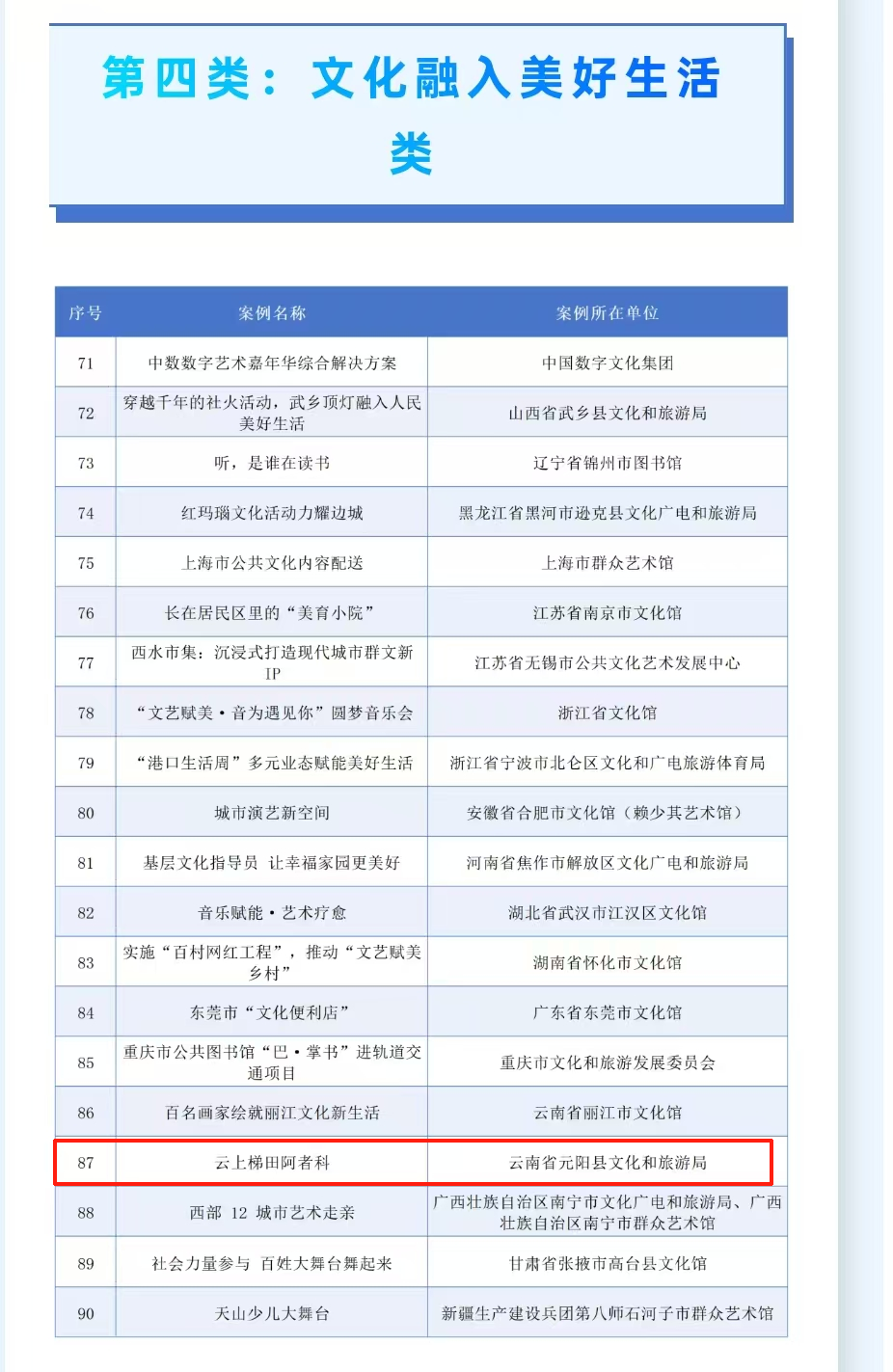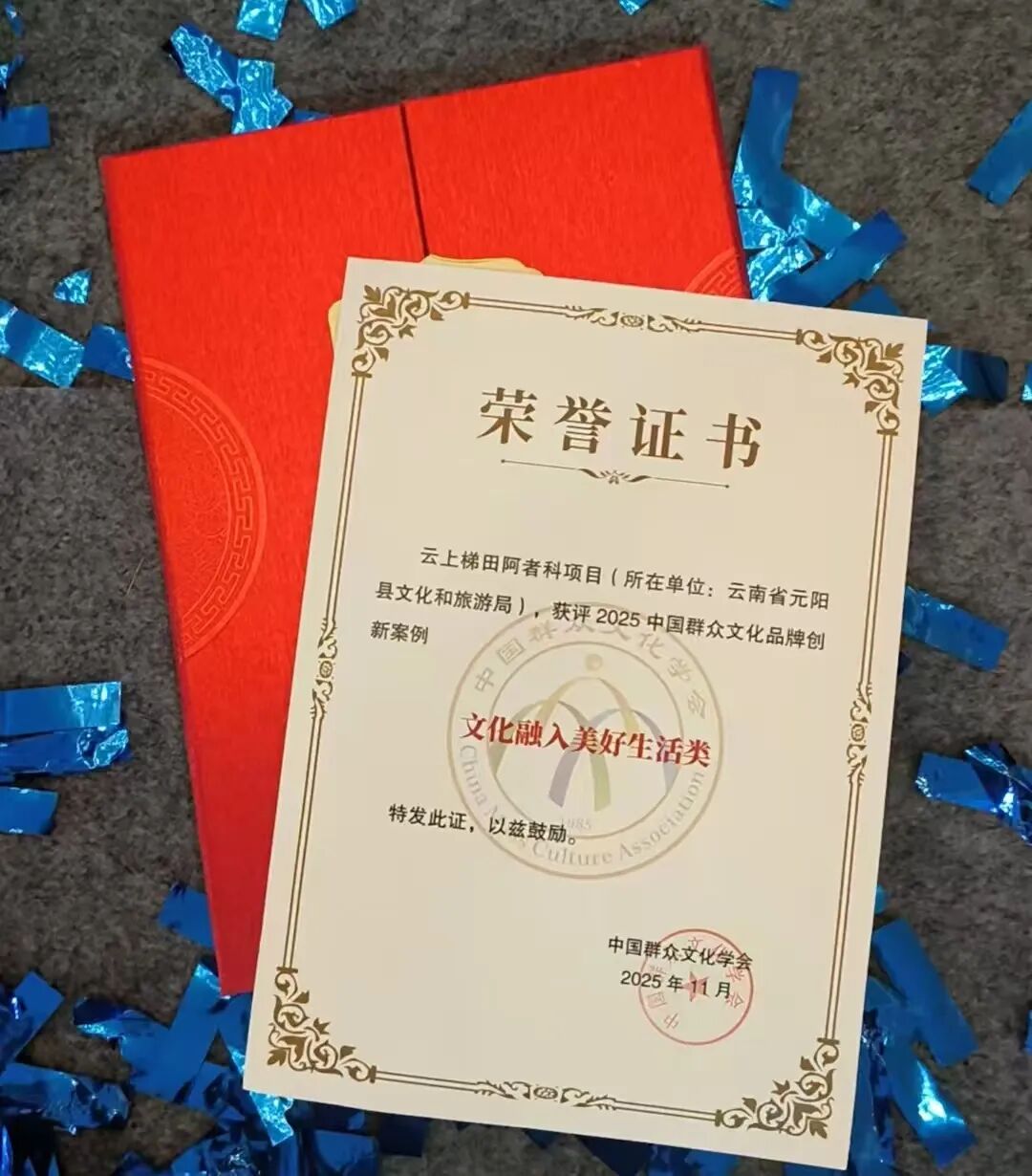 2025年11月7日,在海南省三亚市2025年群众文化品牌创新发展交流活动中,云南省元阳县“云上梯田阿者科”荣获“2025年中国群众文化品牌典型案例”荣誉。在全国722个申报案例中评选出110个典型案例,阿者科就在其列,这是阿者科继“全球减贫案例征集活动最佳案例”“世界旅游组织(WTA)全球旅游减贫案例”“旅游产业赋能城市发展和乡村振兴典型案例”等殊荣后获得的又一案例荣誉。