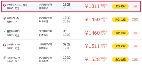从行程看,北京至昆明出发时查询的往返机票价格最低为1311元。