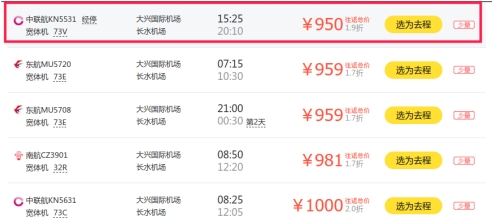从行程看,北京至昆明出发时查询的往返机票价格最低为950元。