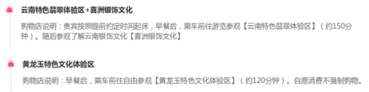 该旅游产品,涉及“云南特色翡翠体验区+喜洲银饰文化、黄龙玉特色文化体验区”两个购物点。