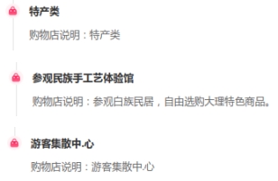 该旅游产品,涉及“特产类、参观民族手工艺体验馆、游客集散中心”三个购物点。