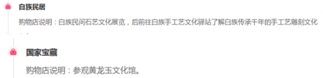 该旅游产品,涉及“白族民居、国家宝藏”两个购物点。
