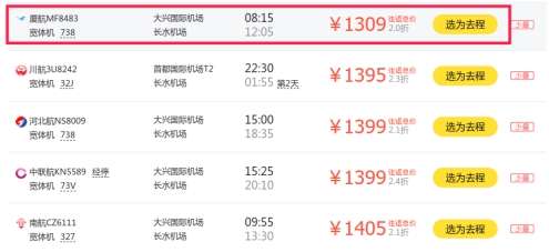 从行程看,北京至昆明出发时查询的往返机票价格最低为1309元。