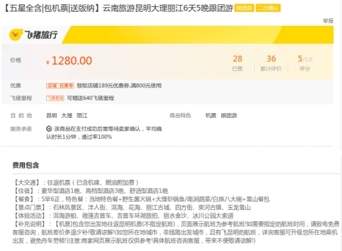 该旅游产品广告链接:【五星全含|包机票|送版纳】云南旅游昆明大理丽江6天5晚跟团游