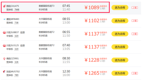 从行程看,北京至昆明出发时查询的往返机票价格最低为1089元。