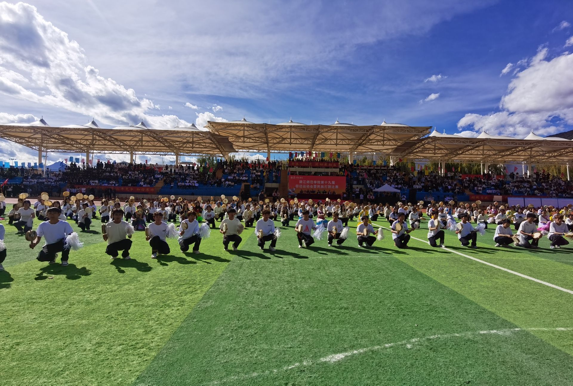 11月7日,丽江师范学院足球场上鼓声激昂、舞姿翩跹,一场主题为“非遗勒巴千人舞 和美文化薪火传”的千人共跳纳西族勒巴舞活动在这里上演。作为纳西族文化活动史上规模空前的勒巴舞展演,1200余名老、中、青三代舞者同台献艺,以磅礴阵容展现了这一省级非遗的深厚底蕴与时代活力。