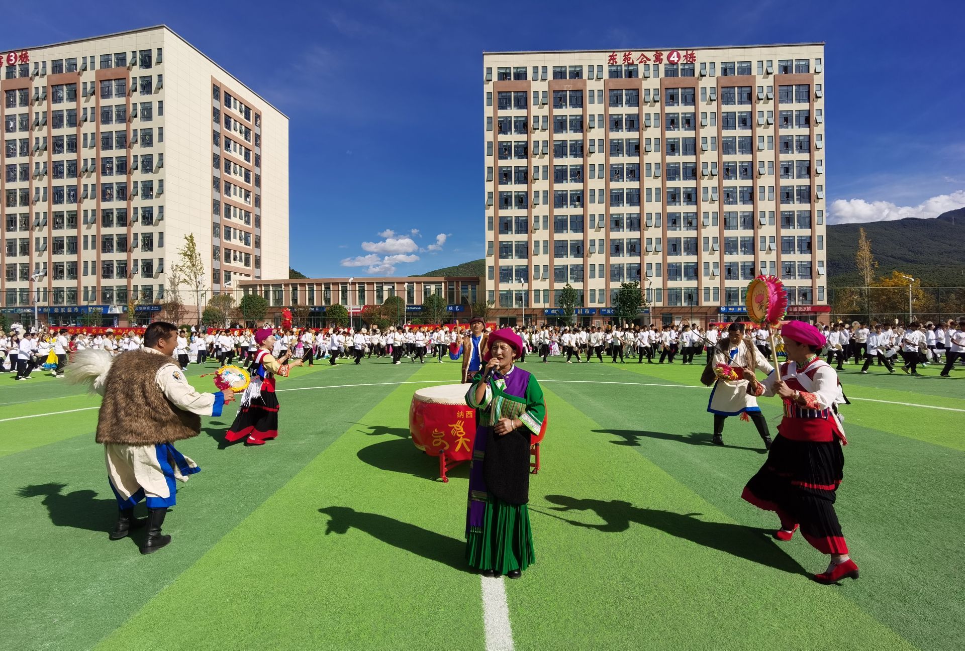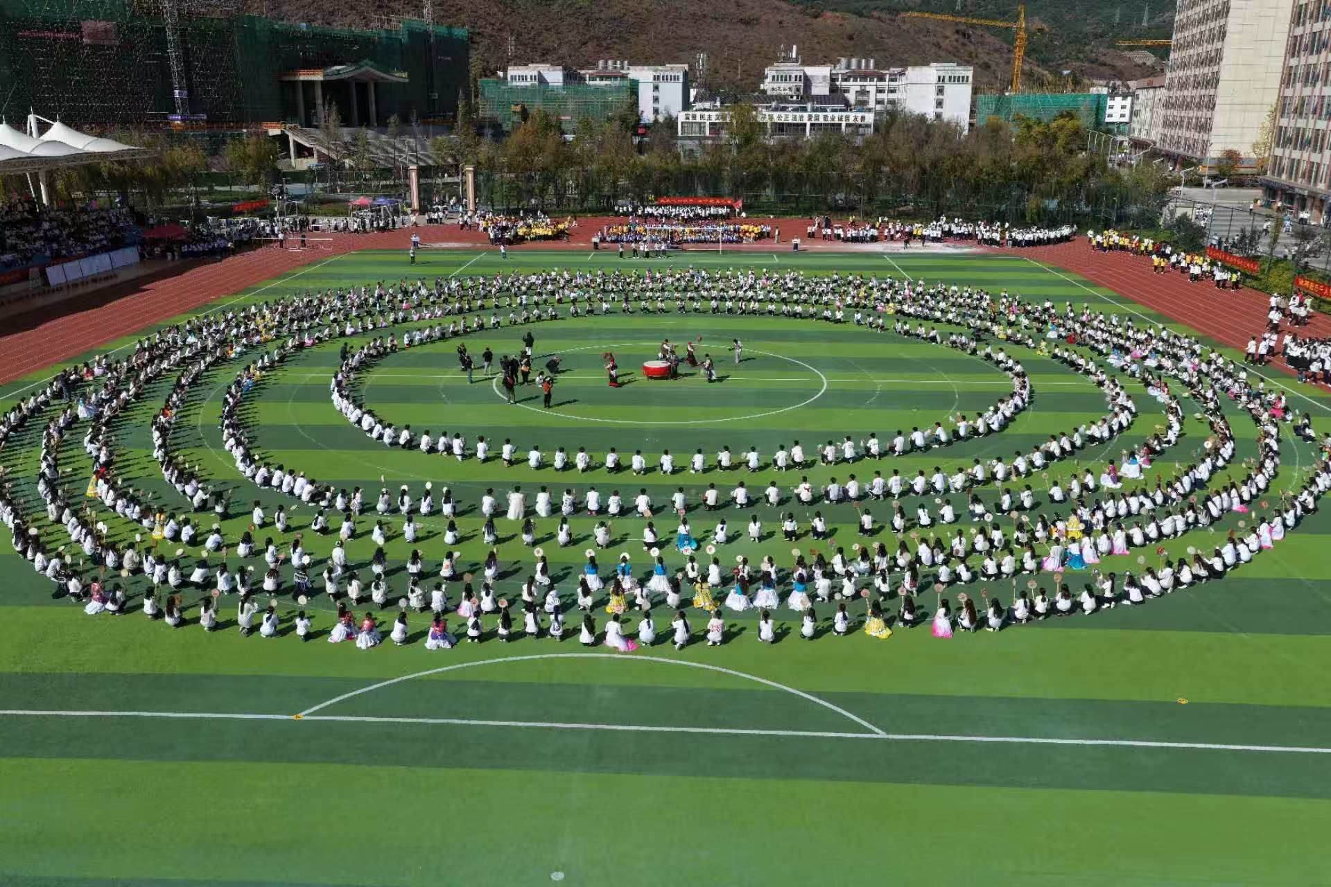 此次活动由玉龙县委宣传部、丽江师范学院、玉龙县文化和旅游局等多部门联合主办。自10月14日起,1200余名丽江师范学院各民族学生与玉龙县勒巴舞传承队成员展开集中培训与排练,经过精心打磨,最终以9分钟的精彩展演呈现了“非遗进校园”实践的丰硕成果。