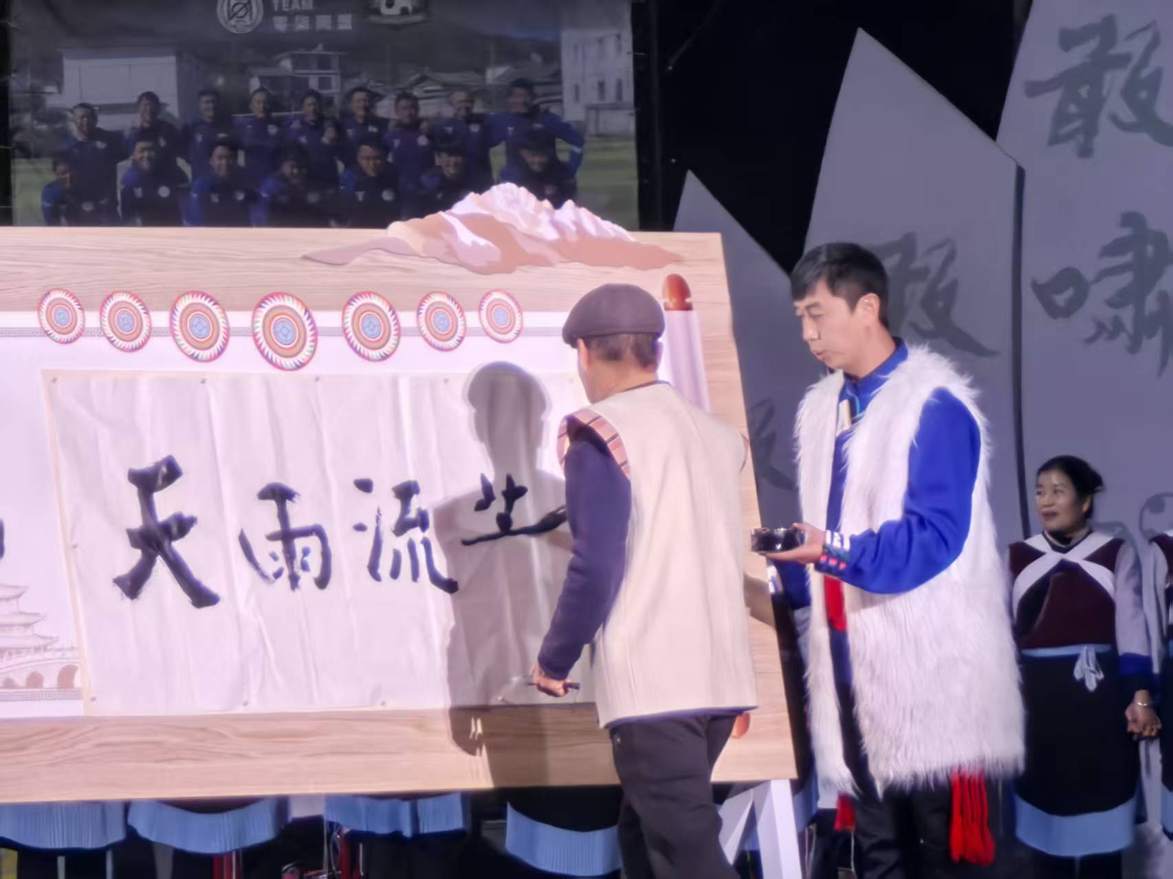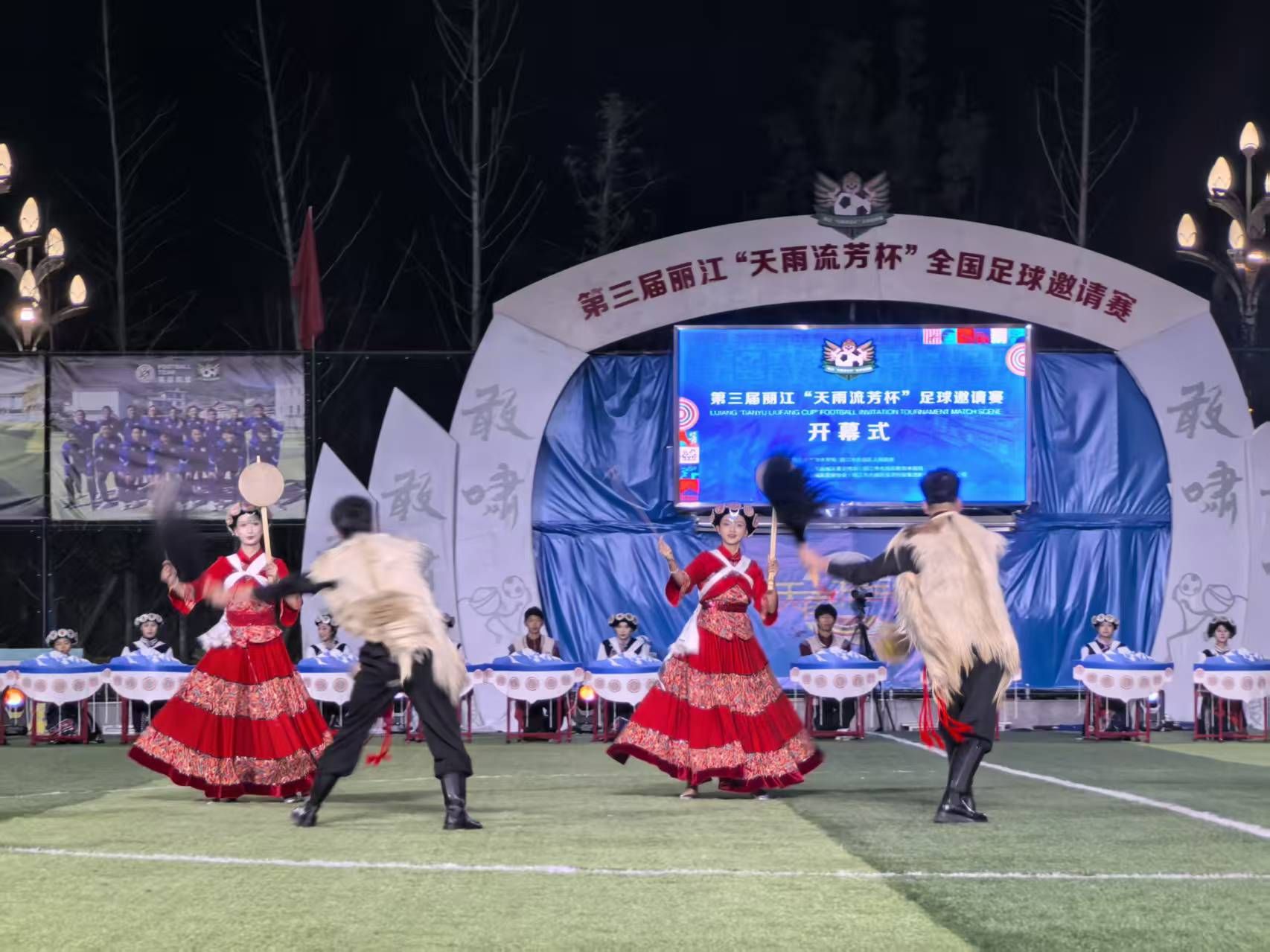 开幕式在庄严的国旗、国际足联公平竞赛旗和赛事会旗入场仪式中正式开始,随后,16支参赛球队依次入场,涵盖多民族队员,展现了中国足球的多元面貌与团结力量。紧接着,开幕式文艺演出融合传统与现代成为活动亮点之一,东巴书法现场创作“天雨流芳”四字,将纳西语中“读书去吧”的文化意蕴与体育精神巧妙联结。《再唱山歌给党听》《月亮花》等节目轮番上演,在丽江夜空下传递出团结奋进的时代强音。在最后进行的揭幕战中,西藏自治区代表队与丽江本土的集龙足球队展开B组首场对决,点燃了全场激情。