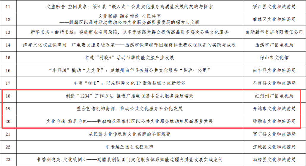 其中,红河州有3个案例成功入选,分别是红河州广播电视局《创新“1234”工作方法 推进广播电视基本公共服务提质增效》、开远市文化和旅游局《整合艺培机构资源,推动公共文化服务社会化发展》、弥勒市文化和旅游局《文化为魂 旅居为体——弥勒梅花温泉社区以公共文化服务推动旅居高质量发展》。(来源 红河文旅)