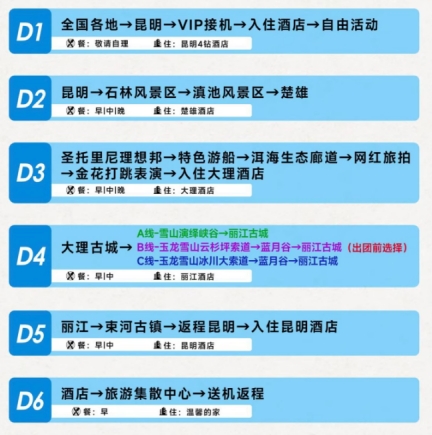 2025年6月3日,“游舆文旅大数据系统”监测到:云南昆明大理丽江6天5晚跟团游石林洱海圣托里尼丽江古城玉龙雪山