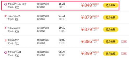 从行程看,北京至昆明出发时查询的往返机票价格最低为849元。