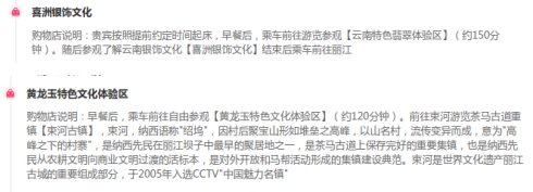 2025年6月17日,监测到标题为“昆明大理丽江。雪山索道+歌舞表演+洱海游船”的旅游产品,涉及“喜洲银饰文化、黄龙玉特色文化体验区”两个购物点。
