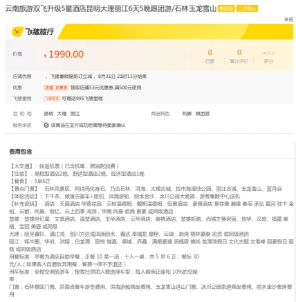 2025年7月1日,监测到标题为“云南旅游双飞升级5星酒店昆明大理丽江6天5晚跟团游/石林玉龙雪山”的旅游产品,涉及“综合购物店、特产超市/购物店”两个购物点。
