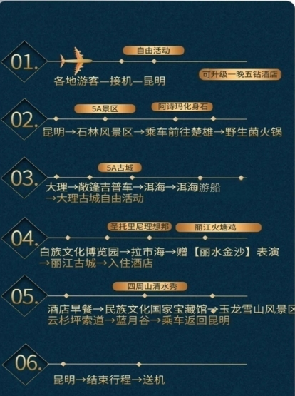 该旅游产品广告链接:云南旅游双飞升级5星酒店昆明大理丽江6天5晚跟团游/石林玉龙雪山