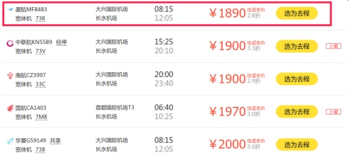 从行程看,北京至昆明出发时查询的往返机票价格最低为1890元。