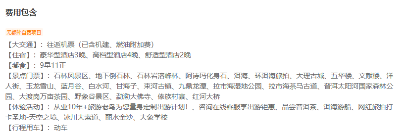 此行程包含往返机票、住宿、餐饮、景区门票、云南省内交通等费用