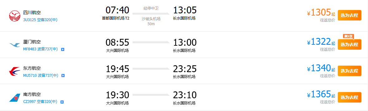 从行程看,从北京至昆明出发时查询的往返机票价格最低为1305元。