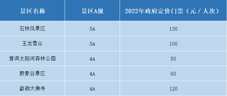 根据云南省《2025年云南团队旅游产品消费提示》,结合2022年政府指导价及市场调节价A级景区名单计算得出: