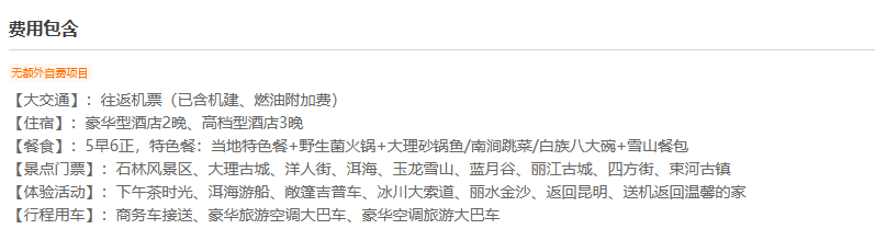 此行程包含往返机票、住宿、餐饮、景区门票、云南省内交通等费用