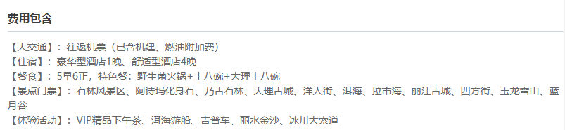 此行程包含往返机票、住宿、餐饮、景区门票、云南省内交通等费用