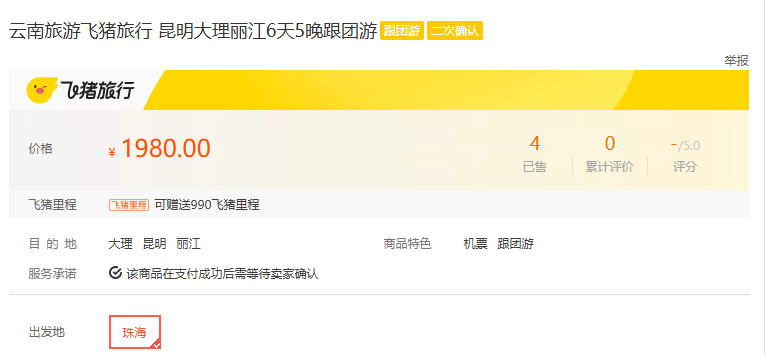 2025年11月4日,云南省文化和旅游厅综合执法监督局联合文旅头条新闻网游舆大数据中心监测到:飞猪旅游网“北京趣哪国旅专营店”云南旅游飞猪旅行 昆明大理丽江6天5晚跟团游