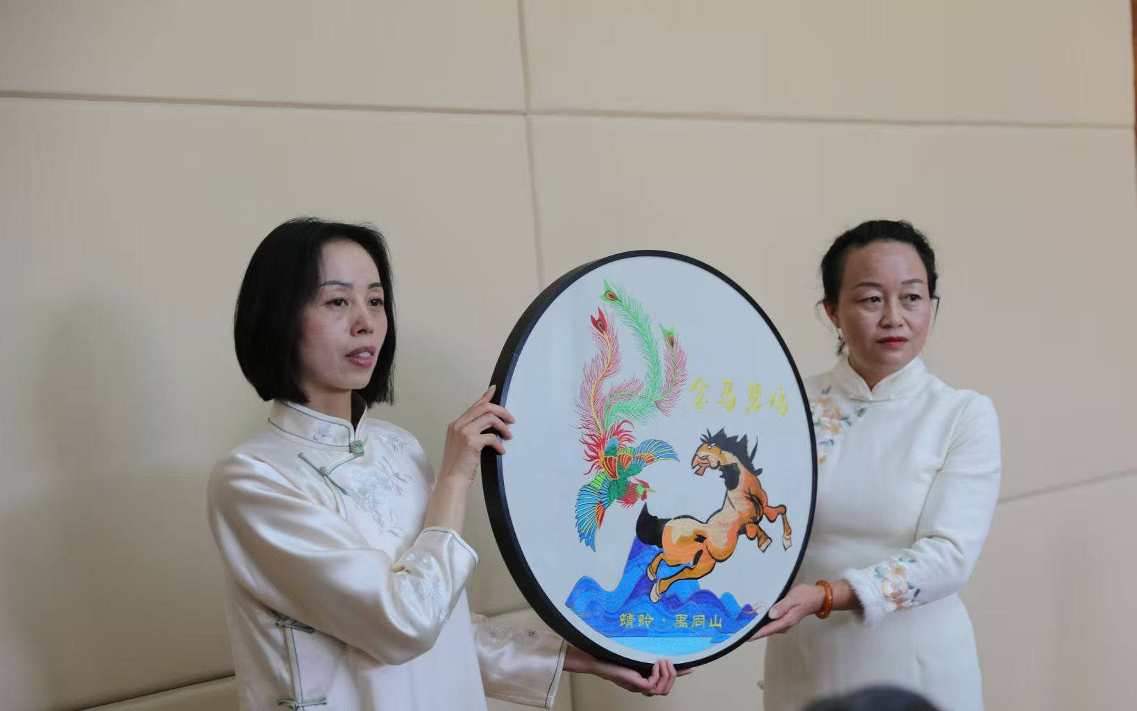 会上展示了起云金主创的《金马碧鸡》文创作品,作品入选在昆明举办的第八届云南民间工艺与文创作品展。作品将金马碧鸡文化与彝绣产业融合,让金马碧鸡文化有了市场载体,让彝绣有了灵动文化的文创作品《金马碧鸡》。
